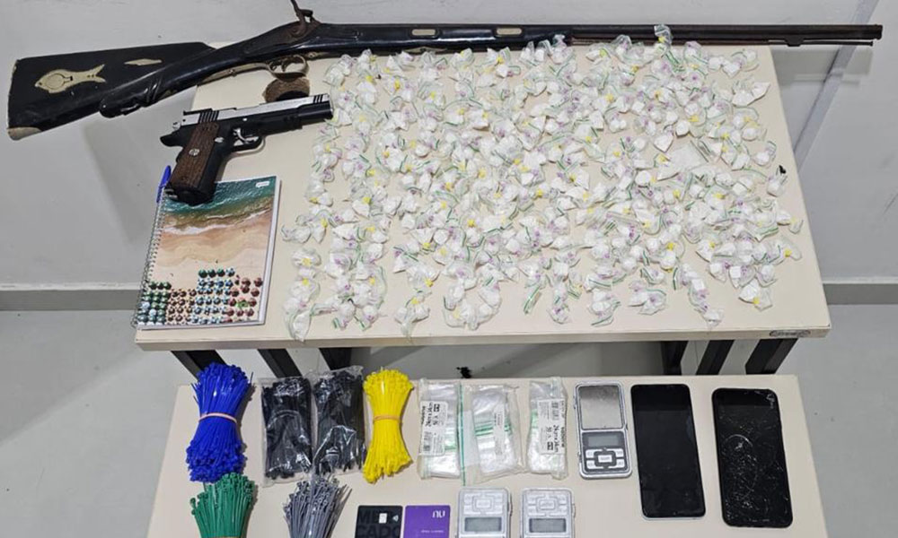 Uma operação da Polícia Militar da Bahia terminou com a apreensão de entorpecentes, armas e a condução de suspeitos na tarde de domingo (19/04), no bairro Urbis V, em Vitória da Conquista. Segundo informações da Rondesp Sudoeste, as guarnições realizavam patrulhamento tático nas proximidades da Praça do Angel quando perceberam a atitude suspeita de um grupo de indivíduos, que tentou fugir ao notar a aproximação policial. Os suspeitos foram alcançados e abordados. Durante a revista, um dos homens tentou se desfazer de uma porção de substância semelhante à cocaína, sendo encontradas outras quantidades com ele. Com uma mulher abordada, os policiais também localizaram porções do mesmo entorpecente. Ao serem questionados, os envolvidos admitiram a prática de tráfico de drogas e indicaram uma residência próxima onde haveria mais material ilícito. No local, os próprios suspeitos autorizaram a entrada das guarnições e mostraram onde a droga estava escondida. Durante a busca, foi encontrada uma quantidade maior da substância, além de itens utilizados na comercialização. Ainda durante a ocorrência, os policiais receberam a informação de que os entorpecentes eram fornecidos por uma mulher que residiria no povoado Baixão, na zona rural. As equipes se deslocaram até o endereço indicado, mas não encontraram a suspeita. No entanto, foram apreendidos um simulacro de arma de fogo e uma espingarda do tipo cartucheira. No total, a ação resultou na apreensão de aproximadamente 300 petecas de substância análoga à cocaína, um simulacro, uma espingarda, três balanças de precisão, dois celulares, cartões de crédito e diversas embalagens utilizadas para o armazenamento de drogas. Os suspeitos e todo o material apreendido foram encaminhados ao Distrito Integrado de Segurança Pública (DISEP), onde o caso foi registrado e as medidas legais cabíveis foram adotadas.