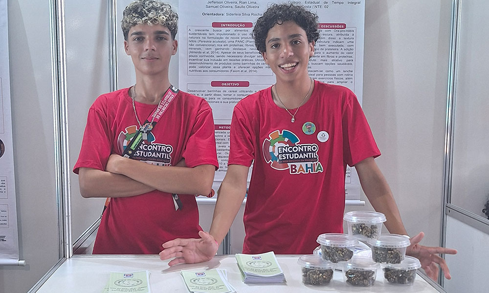 O interesse pelas Plantas Alimentícias Não Convencionais (PANCs) vem crescendo em todo o mundo. Muito disso gira em torno de discussões sobre alimentação saudável, biodiversidade e gastronomia contemporânea. Rica em proteína e ferro, a ora-pro-nóbis (Pereskia aculeata) é um exemplo que tem chamado a atenção de profissionais da saúde e da gastronomia. O potencial dessas “plantinhas” estimulou a professora Siderleia Rocha e os estudantes Samuel Oliveira, Rian Lima, Saullo Oliveira e Jefferson Oliveira, do Colégio Estadual de Tempo Integral Sinésio Costa, localizado no município de Riacho de Santana, a criarem uma barra de cereal à base de ora-pro-nóbis. “A ideia de desenvolver uma barrinha de proteína surgiu a partir do interesse em utilizar PANCs na alimentação cotidiana, valorizando alimentos nutritivos e pouco explorados. A ora-pro-nóbis foi escolhida por ser rica em proteínas, fibras e vitaminas, além de ser acessível e fácil de cultivo”, explica Siderleia. Empolgados com o resultado do projeto, os jovens cientistas, que já pensam em patentear a ideia e empreender, destacam os diferenciais do produto. “Ao contrário de muitas opções industrializadas, nossa barrinha é um produto artesanal, livre de aditivos químicos e processos ultraprocessados. Além disso, utilizamos ingredientes como mel e castanhas para garantir uma formulação estável e funcional, unindo saúde e praticidade”, dizem. Destaque no Encontro Estudantil da Secretaria da Educação, a iniciativa já tem as próximas etapas mapeadas. “Vamos focar na realização de uma análise sensorial para medir a aceitação do público, além de estudos detalhados sobre a estabilidade e o tempo de prateleira da barrinha. Pretendemos ampliar a divulgação da ora-pro-nóbis como alimento funcional, incentivando o consumo consciente dessa PANC através de receitas práticas e nutritivas”, afirma a professora orientadora.