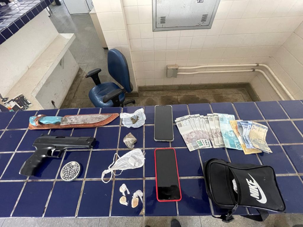 Durante a Operação Força Total, na tarde desta quinta-feira (17), policiais militares da Companhia de Emprego Tático Operacional (CETO), pertencente ao 24º BPM, foram acionados pela Seção de Operações de Inteligência (SOINT) para averiguar um indivíduo em atitude suspeita no Terminal Rodoviário de Brumado, situado na Avenida Centenário. O homem foi localizado e, durante a busca pessoal, os militares encontraram porções de substâncias análogas à maconha, crack e cocaína, além de dois smartphones e a quantia de R$ 1.929,00 em espécie. Na bagagem do suspeito foram localizados ainda uma pistola de pressão, munições calibre 5.5, uma faca de fabricação artesanal e, após consulta ao IMEI, constatou-se que um dos celulares apresentava restrição. Diante dos fatos, o homem de 39 anos foi conduzido e apresentado na Delegacia Territorial para adoção das medidas cabíveis.