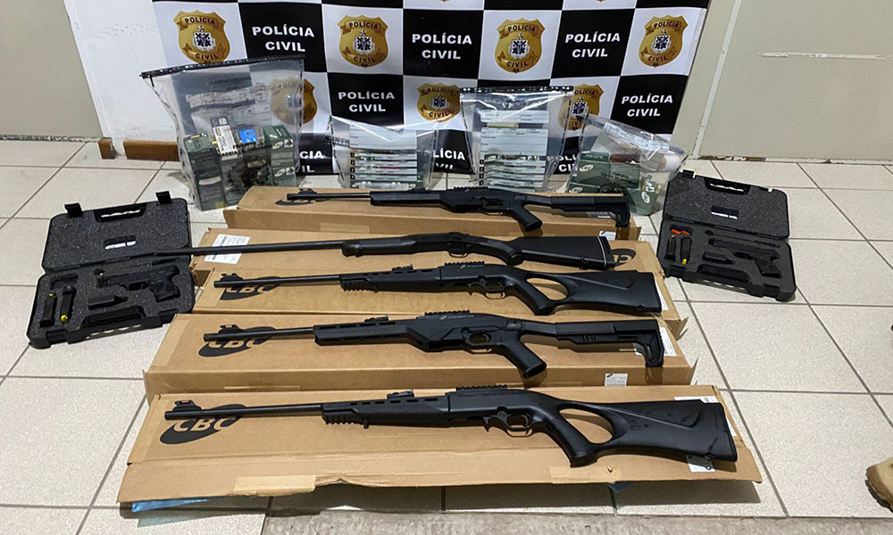 Os levantamentos também indicam que o grupo se dedicava ao comércio ilegal de armas de fogo, incluindo armamentos de calibre restrito. O material apreendido ao longo das diligências inclui centenas de armas, entre elas fuzis, pistolas, revólveres, rifles e modelos de calibre 12, além de grande quantidade de munições e R$ 200 mil em espécie. O volume encontrado reforça a logística sofisticada e a ampla capacidade de distribuição da organização criminosa. A operação também resultou no fechamento de três estabelecimentos suspeitos de comercializar armas e munições de forma irregular: uma grande loja especializada em caça e pesca localizada em Goiânia e outras duas unidades, em Vitória da Conquista e Guanambi.