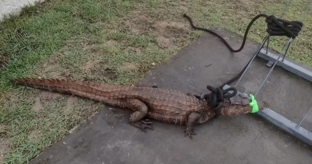 Um jacaré foi resgatado dentro de um condomínio, nesta segunda-feira (08), no bairro de Areia Branca, em Lauro de Freitas, na região metropolitana de Salvador. As informações são do Bahia Noticias com reportagem do G1. Segundo os moradores do local, ninguém ficou ferido. Ao G1, testemunhas informaram que o animal foi encontrado em uma das áreas comuns do condomínio, que é formado por diversos prédios. O caso ocorreu no Condomínio Jardim de Alah. O jacaré foi imobilizado e amarrado pelos moradores para evitar uma reação do animal. A Companhia de Proteção Ambiental (Coppa), foi acionada para o resgate do animal.
