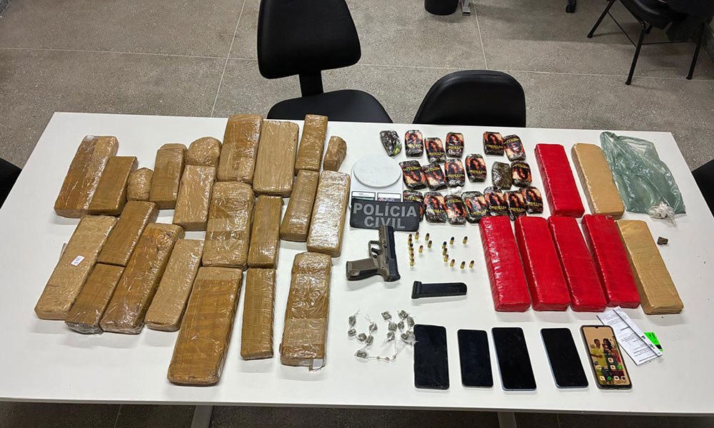 Três pessoas foram presas em flagrante durante uma operação da Polícia Civil da Bahia, realizada na quinta-feira (31), no município de Ibicuí. A ação, conduzida por equipes da Delegacia Territorial da cidade, resultou na apreensão de mais de 18 quilos de maconha, dois quilos de haxixe, 14 porções de maconha, uma de cocaína e três de crack. Além das drogas, foram encontrados uma pistola calibre 9 mm de origem estrangeira, 18 munições, uma balança de precisão e cinco aparelhos celulares. O material foi localizado em três endereços distintos, onde os suspeitos mantinham atividades relacionadas ao tráfico de entorpecentes. De acordo com as investigações, a equipe foi acionada após denúncias sobre um casal que estaria comercializando drogas em um bar. Durante a abordagem, pequenas porções de drogas foram localizadas com uma das mulheres, mas o casal tentou fugir, sendo contidos pela equipe policial. As diligências levaram os policiais a outras residências ligadas ao grupo, onde foram encontrados os entorpecentes e a arma de fogo. Na última localidade averiguada, outros três indivíduos foram encontrados, entre eles um homem posteriormente identificado como integrante do grupo criminoso. Dois suspeitos conseguiram fugir, e as investigações seguem em andamento para localizá-los. Os presos foram autuados em flagrante por tráfico de drogas e porte ilegal de arma de fogo. Após os procedimentos legais, foram encaminhados ao Complexo Policial de Itapetinga, onde permanecem custodiados, à disposição da Justiça.